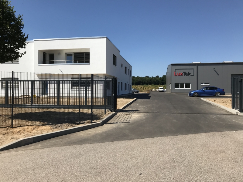 Halle und BürogebäudeLuxTek in NiederlosheimProjekt: Planung und schlüsselfertige Erstellung einer Stahlhalle mit Bürogebäude für die Firma LuxTek in Niederlosheim Größe: